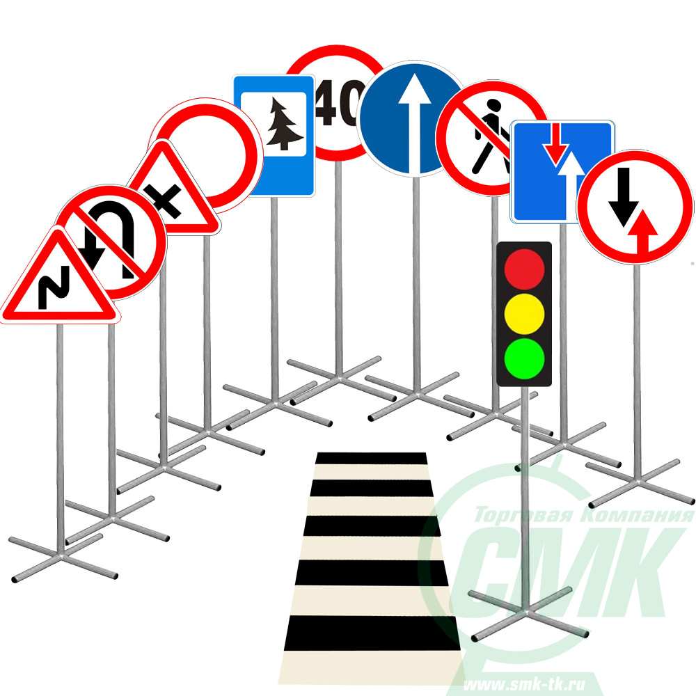 10 знаков , светофор , зебра. Размеры знака:250х250х1100мм Из металлической трубы 18 и 22мм , ПВХ Зебра: поролон,кожзам 1000х600мм Стойки разборные. Вес набора 15 кг
