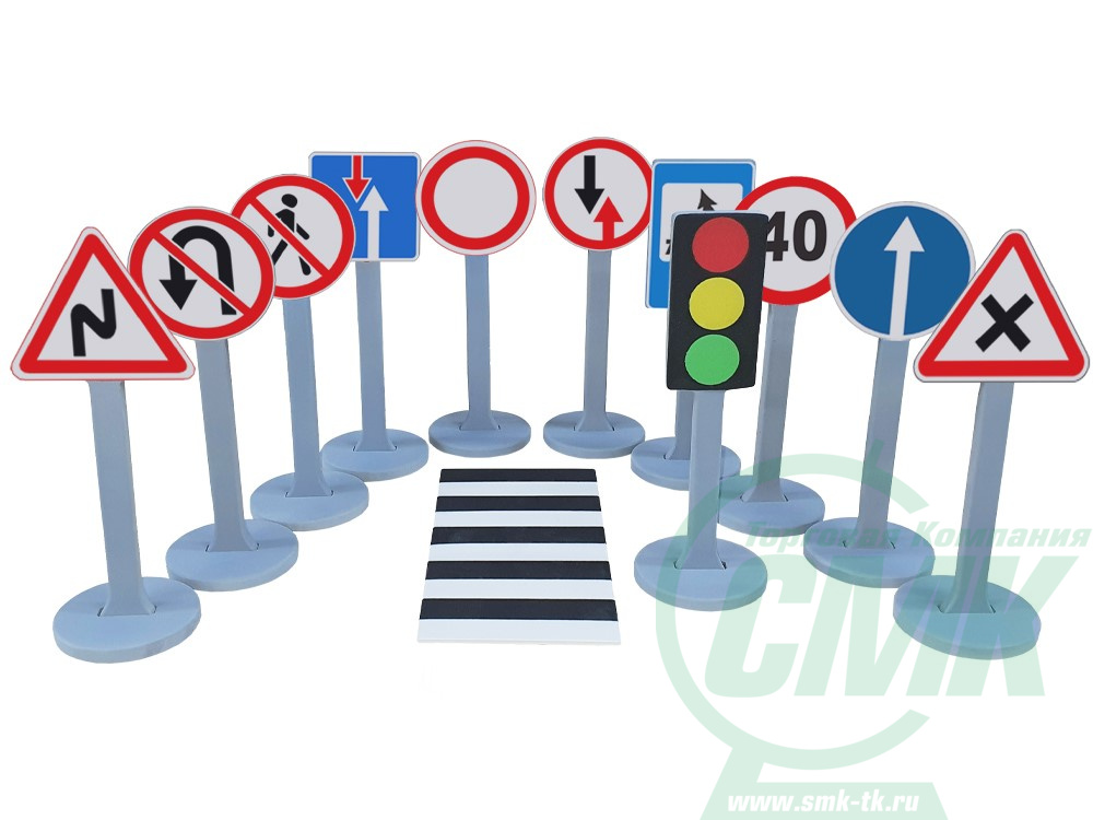 10 знаков , светофор , зебра. Диаметр знака 60мм; высота 200мм Из ПВХ - УФ Печать. Зебра: ПВХ - УФ Печать.200х100мм Стойки из массива и фанеры. Вес набора 3 кг