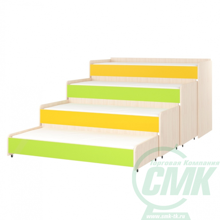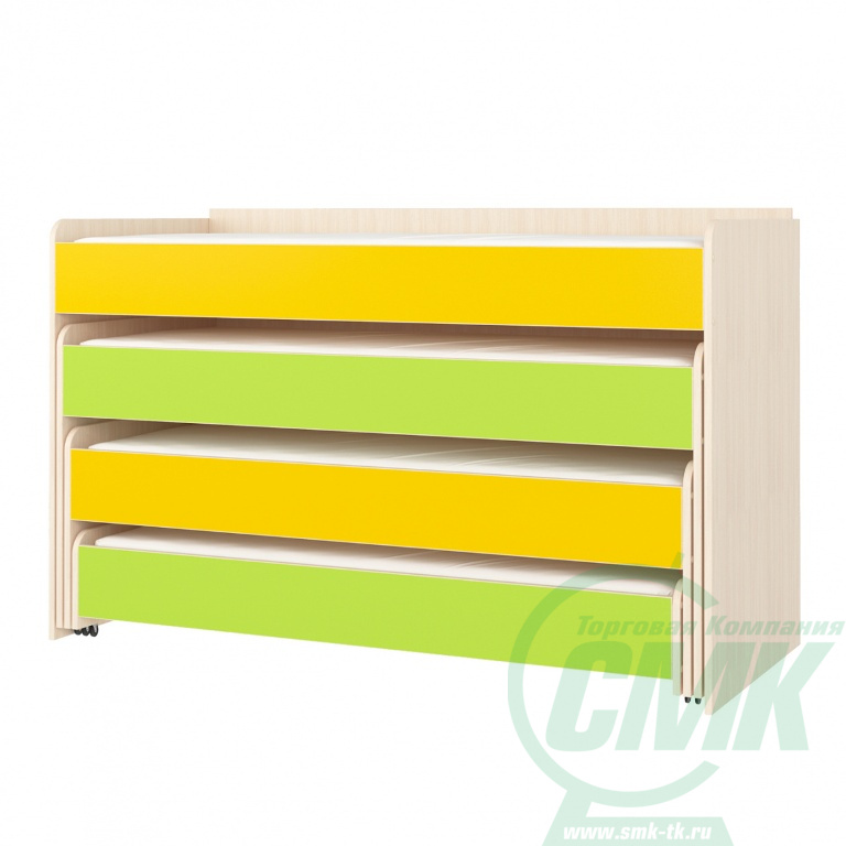 Возможные цвета: Ваниль / Голубой / Желтый / Зеленый / Красный / Оранжевый / Розовый / Синий Кровать детская 4-х ярусная, трансформируется из одной в четыре спальных места. Размер в разложенном состоянии 2492 см. Размер ложе 1- 636*1450, 2- 618*1400см, 3- 600*1350 , 4- 600*1300 см. Экономит пространство .Кровать изготовлена из ЛДСП 16 мм, все детали обработаны кромкой ПВХ 2мм.Ложе МДФ 8мм.Корпус дуб молочный Кровать представляет собой систему выдвижных элементов. Единая конструкция представляет собой совокупность четырех кроватей, собирающихся по типу «матрешки». Лежак представляет собой каркас соединенный планками из ЛДСП шириной не менее 50 мм. Задние бортики кроватей выступают, что при выдвижении позволяет кроватям цепляться друг за друга. Нижние части опор(боковин) кроватей оборудованы колесными опорами. Все углы закруглены. Цвет: по согласованию с заказчиком. Вся продукция сертифицирована