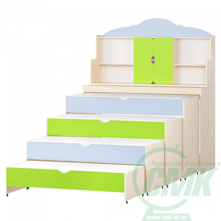 Возможные цвета: Ваниль / Голубой / Желтый / Зеленый / Красный / Оранжевый / Розовый / Синий Кровать детская 4-х ярусная тумба с надстройкой трансформируется с одной в четыре спальных места. Размер в разложенном состоянии 3166 см. Размер ложе 1- 636*1450, 2- 618*1400см, 3- 600*1350 , 4- 600*1300 см. Экономит пространство .Кровать изготовлена из ЛДСП 16 мм, все детали обработаны кромкой ПВХ 2 мм .Ложе МДФ 8мм Кровать представляет собой систему выдвижных элементов. Единая конструкция представляет собой совокупность четырех кроватей, собирающихся по типу «матрешки». Лежак представляет собой каркас соединенный планками из ЛДСП шириной не менее 50 мм. Задние бортики кроватей выступают, что при выдвижении позволяет кроватям цепляться друг за друга. Нижние части опор(боковин) кроватей оборудованы колесными опорами. Цвет: по согласованию с заказчиком. Вся продукция сертифицирована