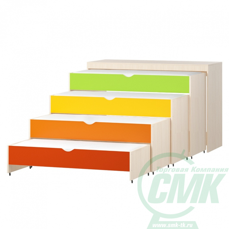 Возможные цвета: Ваниль / Голубой / Желтый / Зеленый / Красный / Оранжевый / Оранжевый / Синий Кровать детская 4-х ярусная тумба трансформируется с одной в четыре спальных места . Размер в разложенном состоянии 3166 см. Размер ложе 1- 636*1450, 2- 618*1400см, 3- 600*1350 , 4- 600*1300 см. Экономит пространство .Кровать изготовлена из ЛДСП 16 мм, все детали обработаны кромкой ПВХ 2мм.Ложе МДФ 8мм .Корпус дуб молочный Кровать представляет собой систему выдвижных элементов. Единая конструкция представляет собой совокупность четырех кроватей, собирающихся по типу «матрешки». Лежак представляет собой каркас соединенный планками из ЛДСП шириной не менее 50 мм.Задние бортики кроватей выступают, что при выдвижении позволяет кроватям цепляться друг за друга. Нижние части опор(боковин) кроватей оборудованы колесными опорами. Цвет: по согласованию с заказчиком. Вся продукция сертифицирована