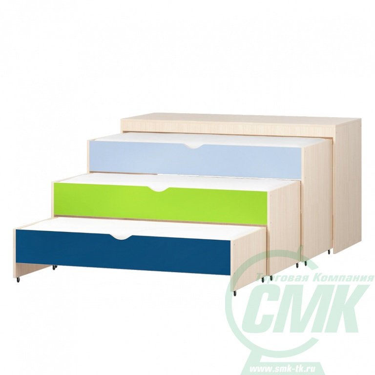 Возможные цвета: Ваниль / Голубой / Желтый / Зеленый / Красный / Оранжевый / Розовый / Синий Кровать детская 3-х ярусная тумба"Улыбка" трансформируется с одной в три спальных места .Размер в разложенном состоянии 2532 см. Размер ложе 1- 618*1400, 2- 600*1350см, 3- 600*1300 см. .Экономит пространство .Кровать изготовлена из ЛДСП 16 мм, все детали обработаны кромкой ПВХ 2мм.Ложе МДФ 8мм.Корпус дуб молочный Кровать представляет собой систему выдвижных элементов. Единая конструкция представляет собой совокупность трех кроватей, собирающихся по типу «матрешки». Лежак представляет собой каркас соединенный планками из ЛДСП шириной не менее 50 мм. Задние бортики кроватей выступают, что при выдвижении позволяет кроватям цепляться друг за друга. Нижние части опор(боковин) кроватей оборудованы колесными опорами. Цвет: по согласованию с заказчиком. Вся продукция сертифицирована