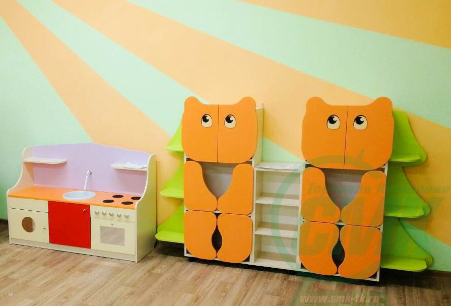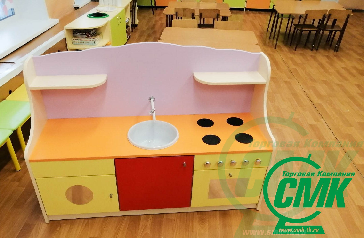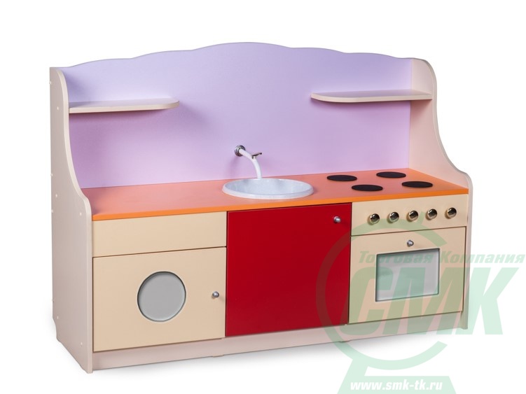 3 закрытых бокса 2 открытые полки- дополнительные возможности хранения игрового инвентаря Имитация крана, раковины, конфорок, стиральной машины, духовки Очень компактное изделие — идеально для игры в младших группах, всё в зоне доступности для ребенка