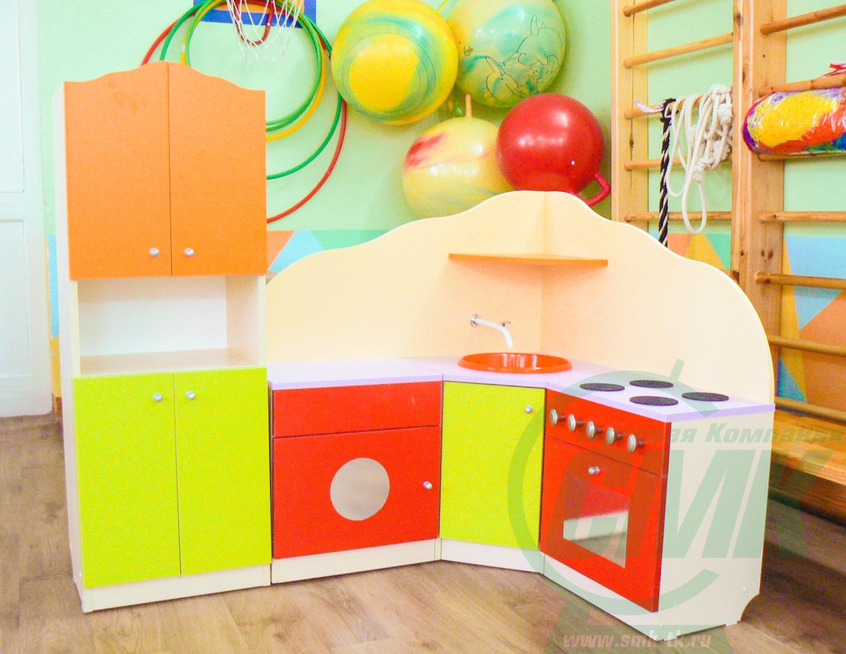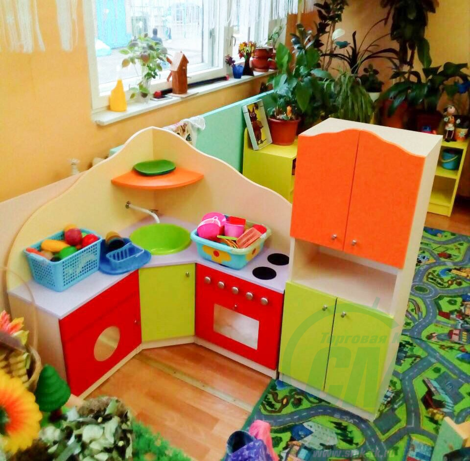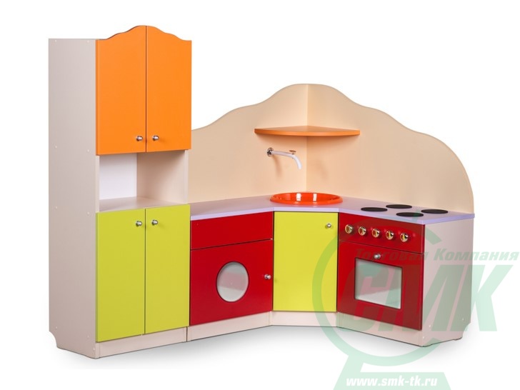 5 закрытых боксов с полками — дополнительные возможности хранения игрового инвентаря Имитация крана, раковины, конфорок, стиральной машины, духовки Очень компактное изделие — возможность для игры в младших группах Угловое расположение — экономия пространства