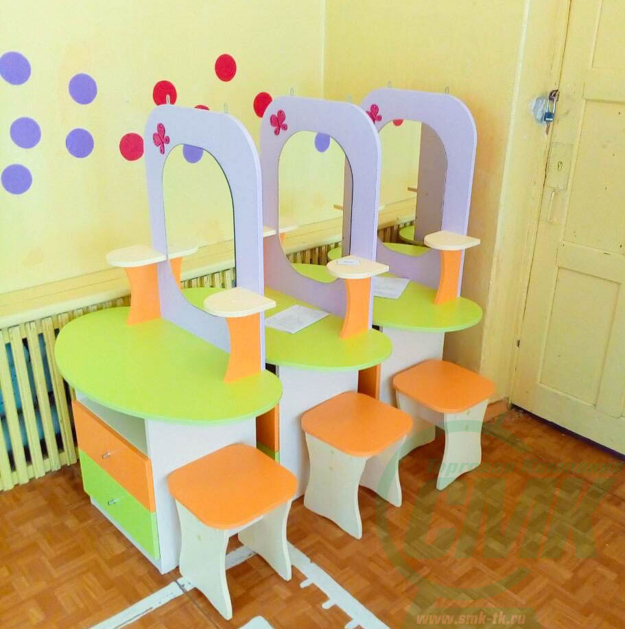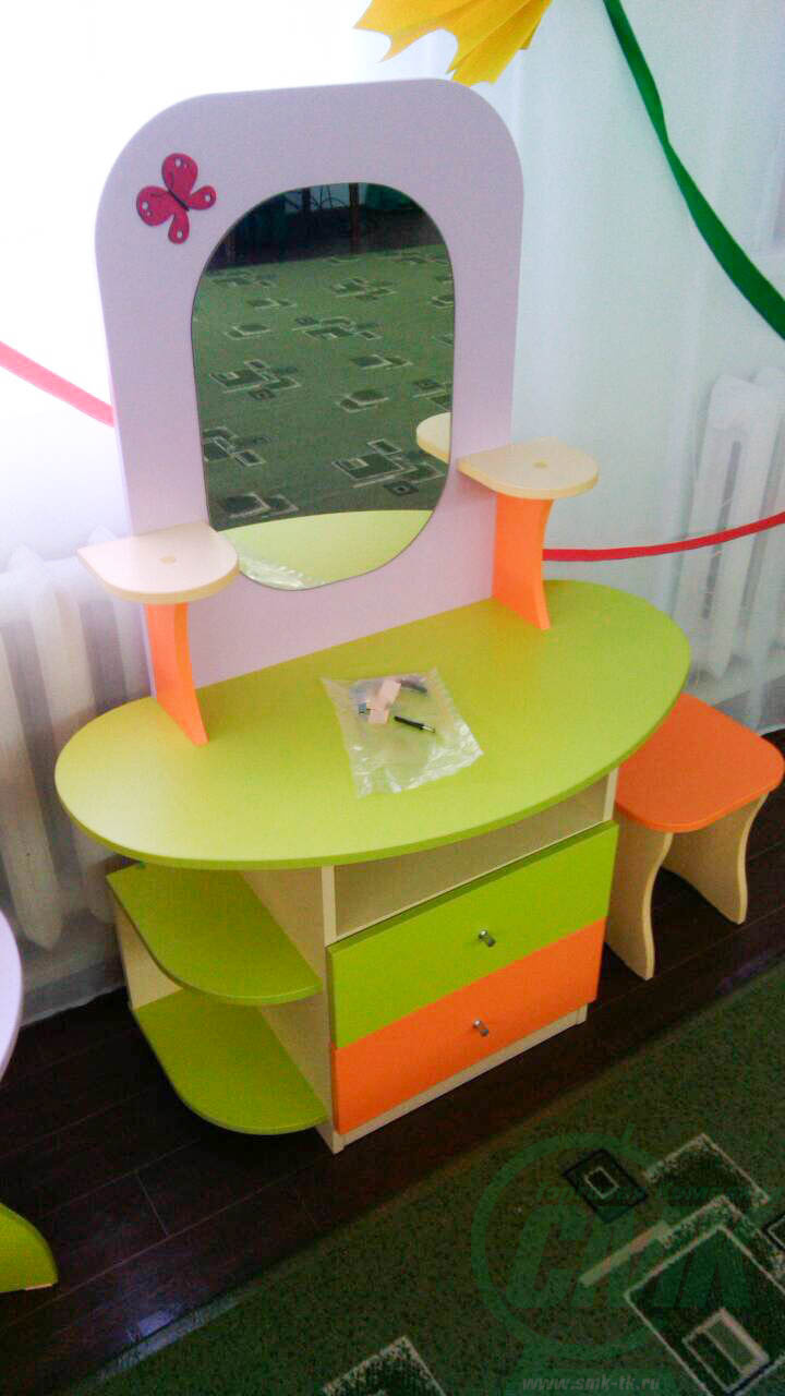Изделие состоит из двух предметов 2 выдвижных ящика внизу 5 открытых полок и ниш Настоящее зеркало (кромка обработана) Овальная столешница Наличие декоративного элемента