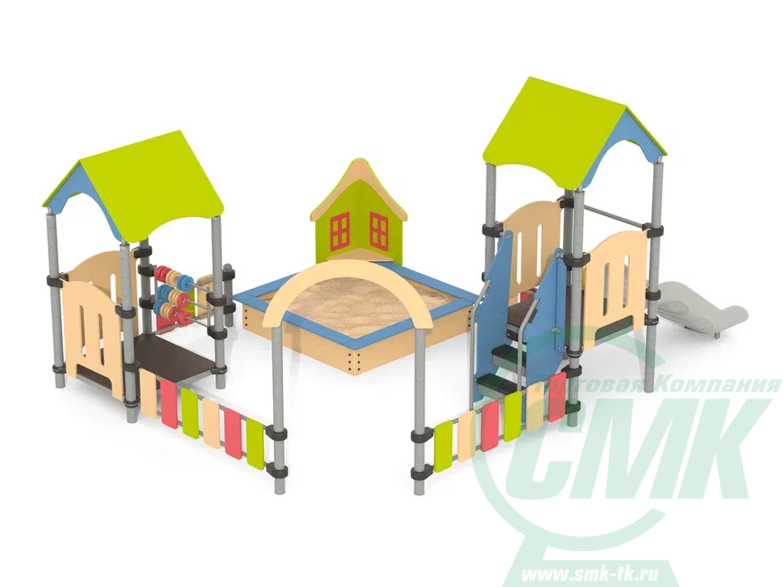 Песочный дворик с горкой – это яркий игровой комплекс с песочницей, горкой и домиками. На домиках установлены счеты, которые помогают развивать мелкую моторику и учиться счету. Игры с песком также развивают мелкую моторику, фантазию и усидчивость. Может устанавливаться на любых площадках. Является не только практичным игровым оборудованием, но и эстетически красивым украшением площадок.