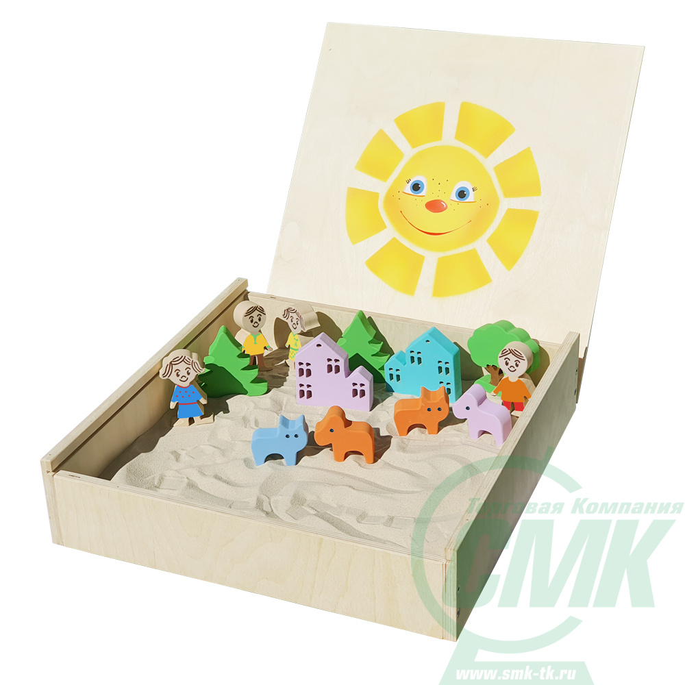 Выдвижная крышка с трафаретным рисунком. Песок кварцевый 6 кг. 13 фигурок МДФ 25мм Использовать сухой или слегка увлажнённый песок.
