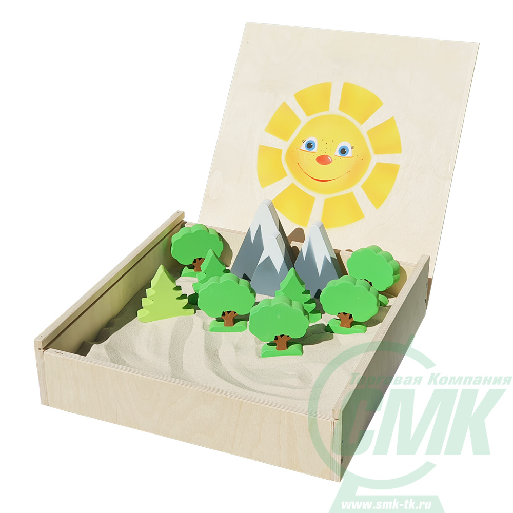 Выдвижная крышка с трафаретным рисунком. Песок кварцевый 6 кг. 11 фигурок МДФ 25мм Использовать сухой или слегка увлажнённый песок.