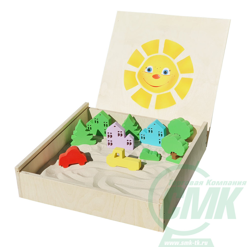 Выдвижная крышка с трафаретным рисунком. Песок кварцевый 6 кг. 10 фигурок МДФ 25мм Использовать сухой или слегка увлажнённый песок.
