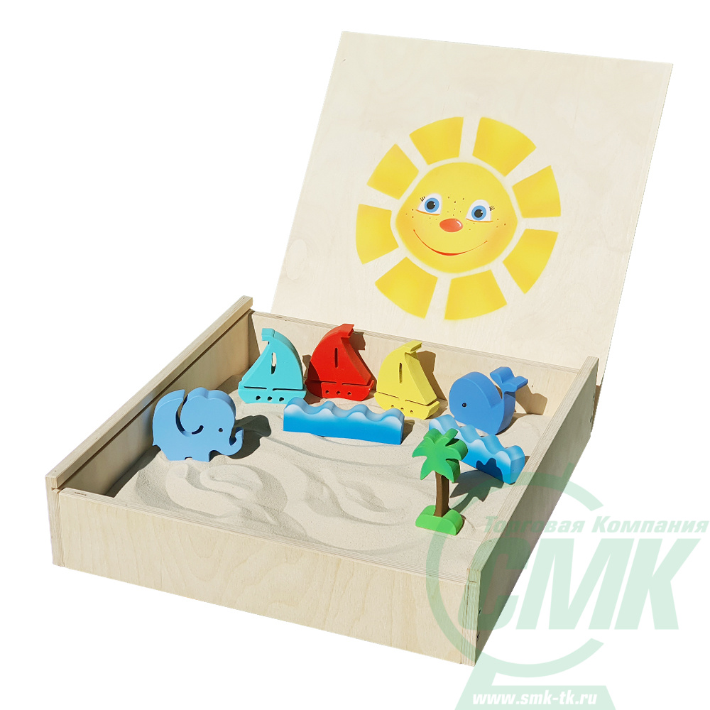 Выдвижная крышка с трафаретным рисунком. Песок кварцевый 6 кг. 8 фигурок МДФ 25мм Использовать сухой или слегка увлажнённый песок.