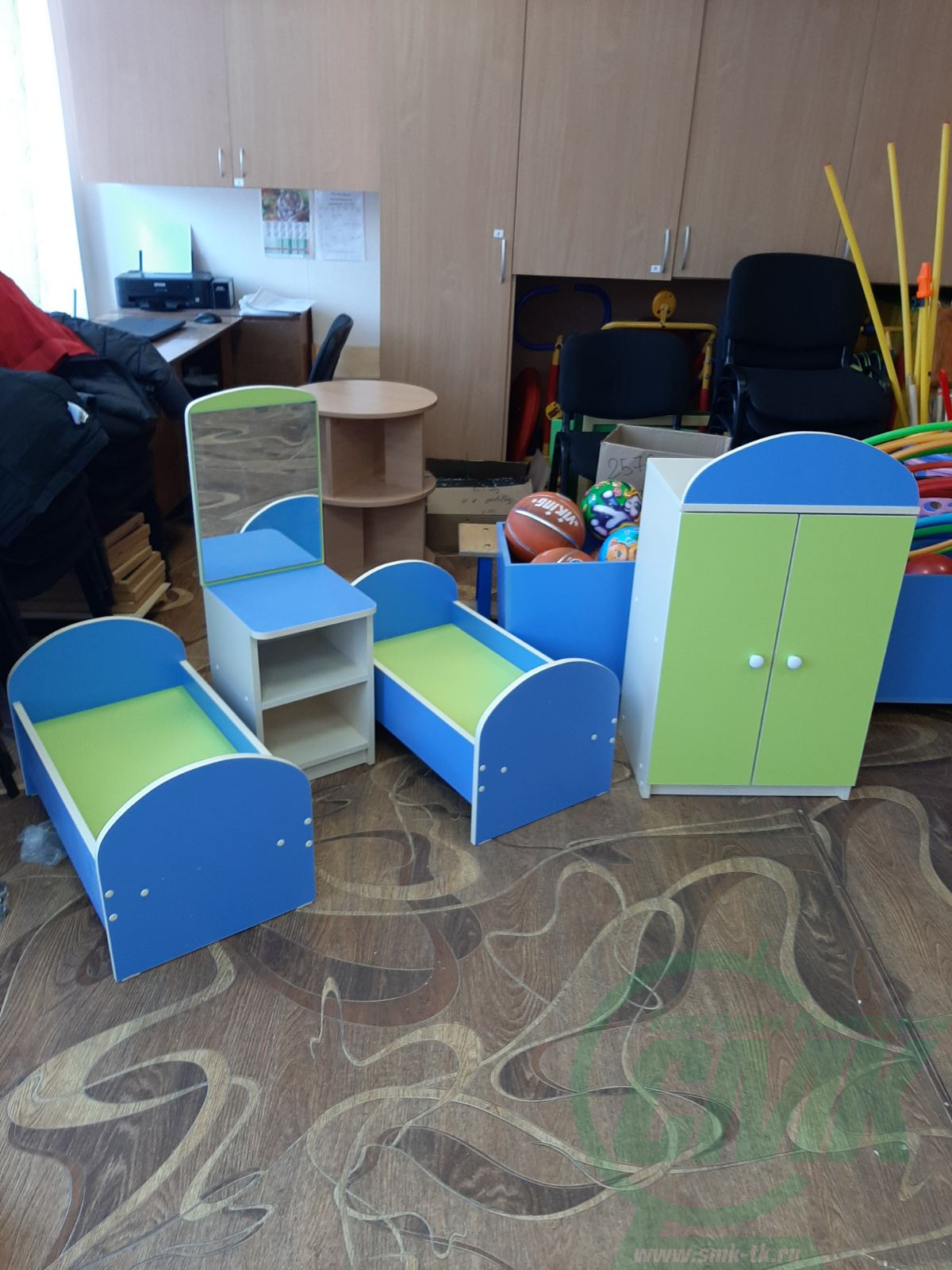 Шкаф 500х350х900мм - 1 шт. Кровать 400х700х400мм - 2 шт. Трюмо 300х300х900мм - 1 шт. Варианты цветов ЛДСП уточняйте в отделе продаж