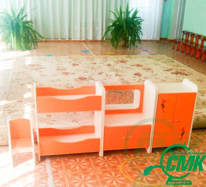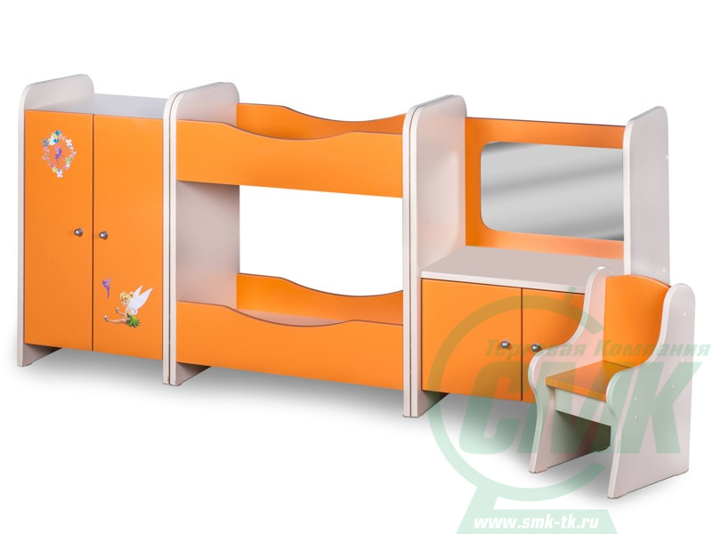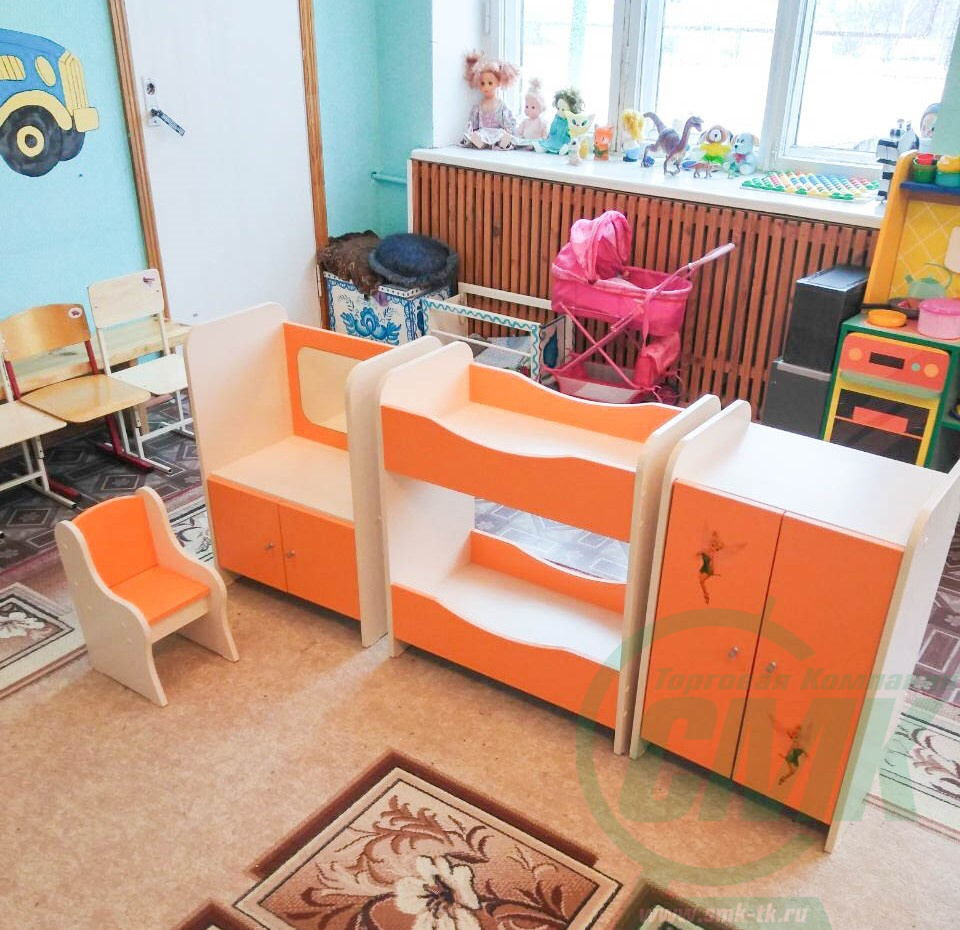 В комплект входят: двустворчатый шкаф для кукольного белья, трюмо с настоящим зеркалом и стульчиком, двухъярусная кровать Игровую зону можно составить вместе в виде стенки или раскомплектовать на отдельные изделия Вместительные закрытые пространства для размещения игрового инвентаря Кровать предназначена для игры с куклами и мягкими игрушками