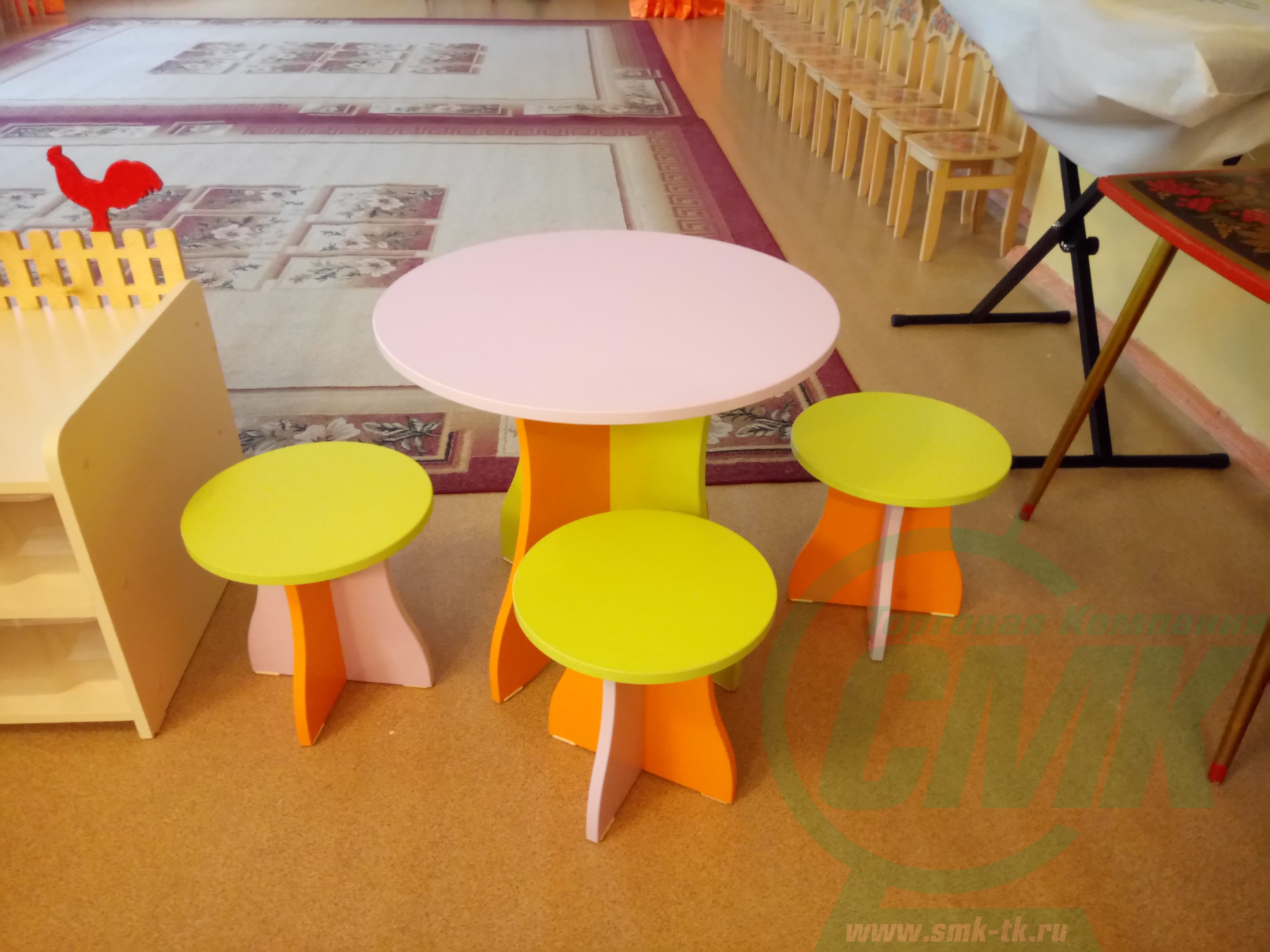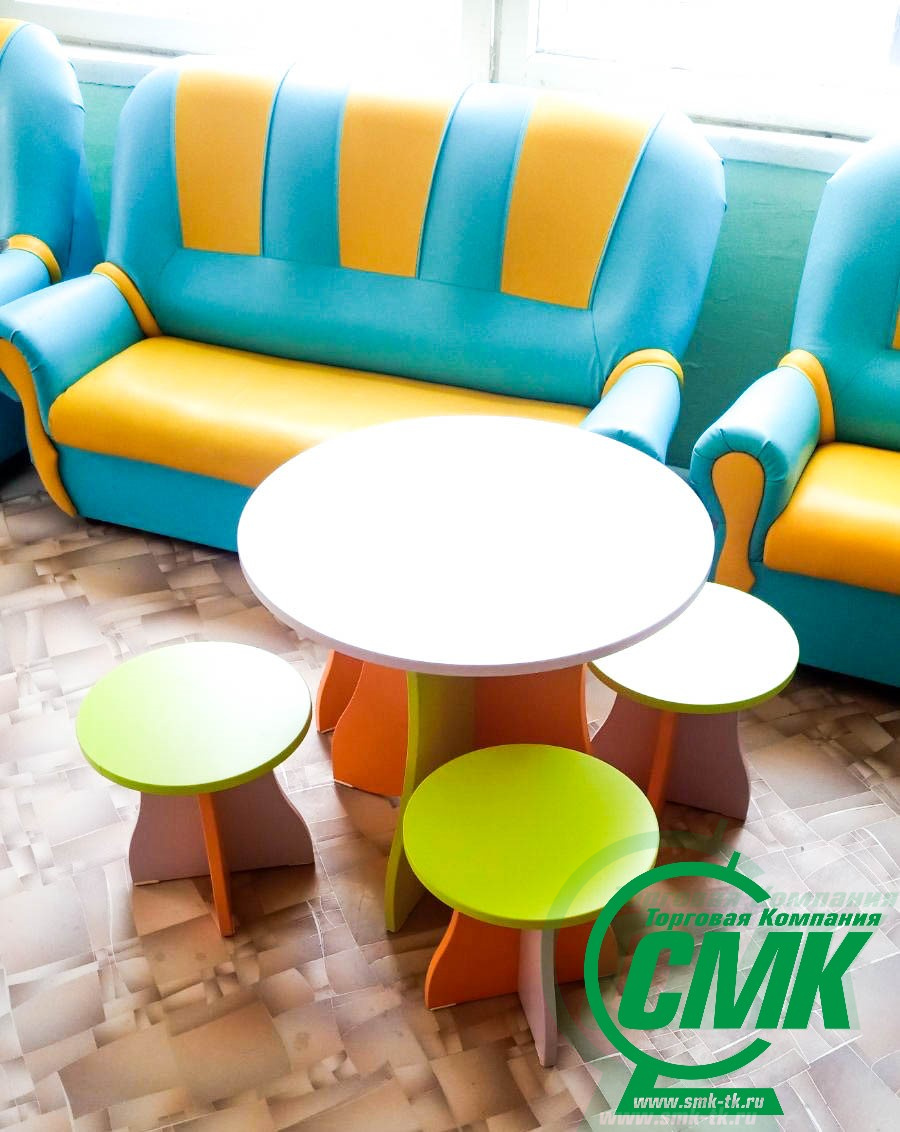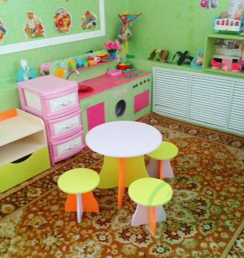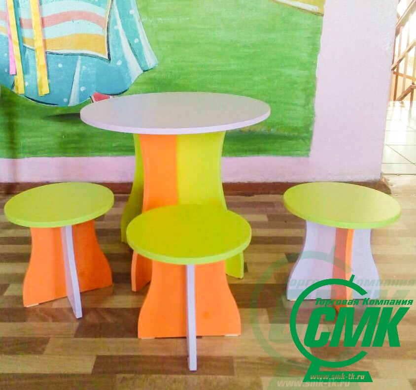 Изделие состоит из четырех предметов: стола и трех табуретов Может использоваться как отдельная зона для игры и как докомплектация других игровых уголков Мобильность составных частей комплекта — возможность оптимального использования пространства