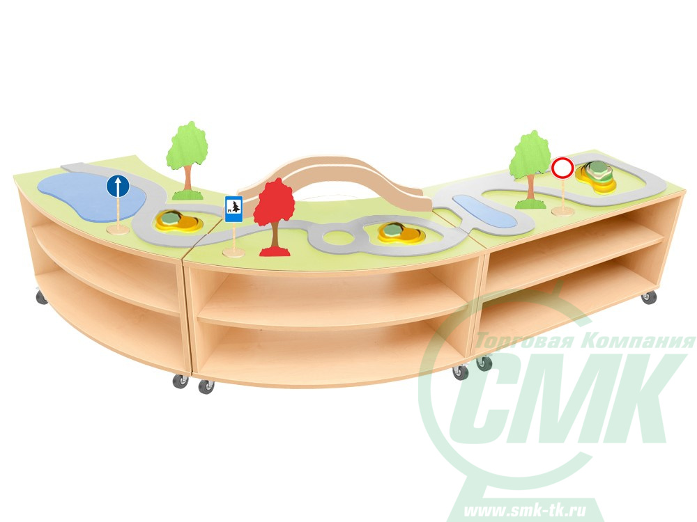ЛДСП 16мм., кромка ПВХ. Игровые элементы из МДФ. Установлены пластиковые или усиленные поворотные прорезиненные колеса. 2 из них со стопором (тормозом).