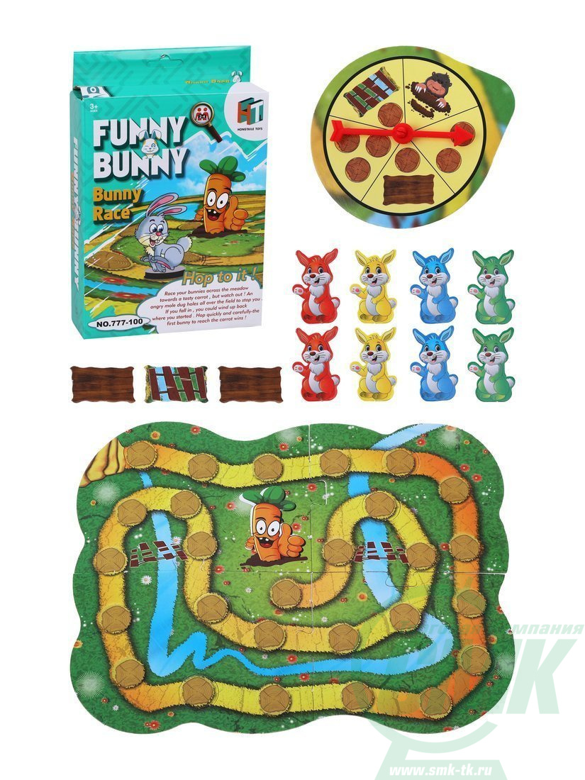 комплекте: игровое поле, 8 фишек с кроликами (4-х цветов), спиннер, 2 фишки с