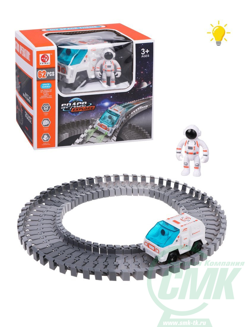 соединяются между собой), фигурка космонавта, электрифицированная машинка.Во время работы машинки фары игрушки подсвечиваются, машинка