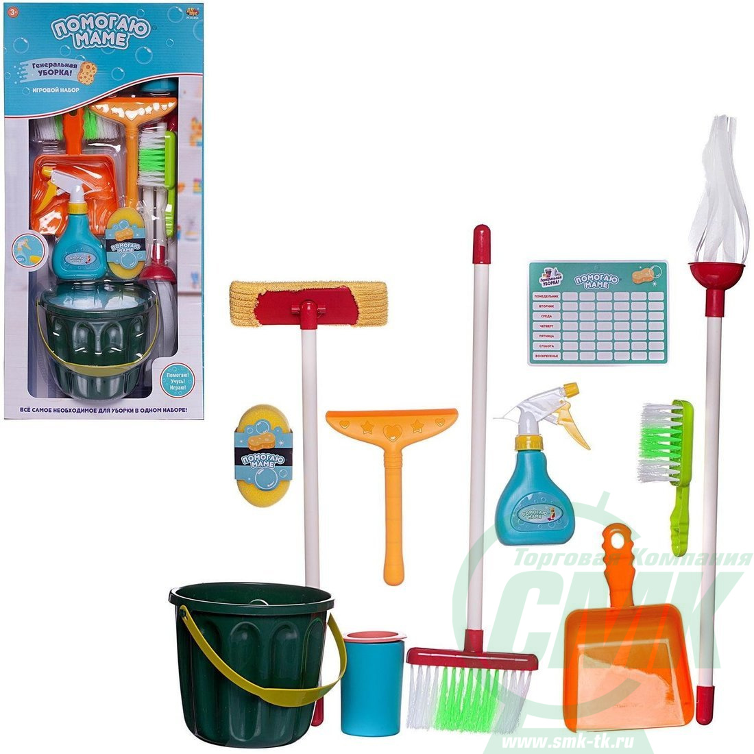 В состав набора входят: ведро 17х15,5см, совок 22х14см, щетка для пола 52см, 2 швабры (63 и 45,5 см), щетка 16,5х14см, водосгон 19,5х14см, чистящий порошок (муляж), губка, «моющее средство» с пульверизатором (муляж), график уборки.