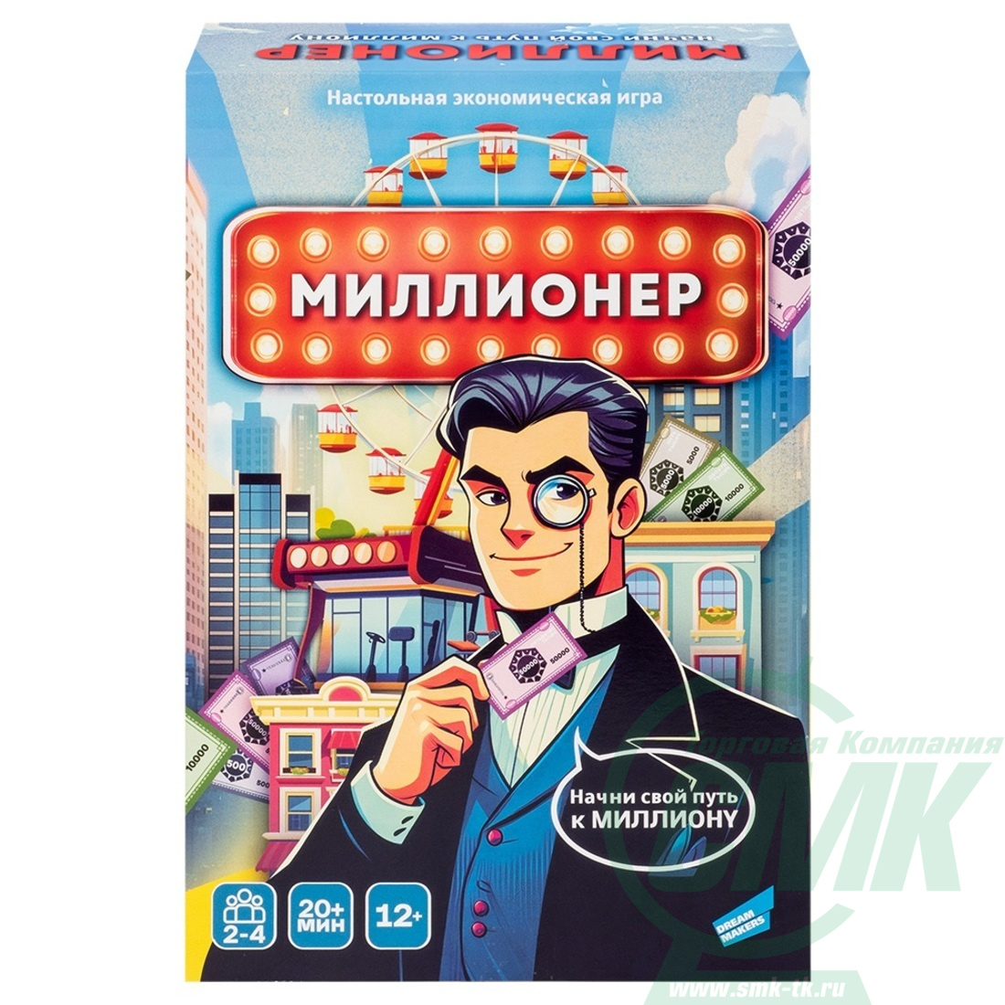 Хотите открыть свою кофейню? Мечтаете о собственном аквапарке? Все это возможно в игре "Миллионер. New"! Это классичсекая экономическая игра, в которой вы можете покупать и продавать предприятия, проводить аукционы и даже строить целые отрасли. Развивайте свой бизнес и становитесь богаче, продумывайте стратегию и конкурируйте с другими игроками. Рискуйте и побеждайте! Комплектация: Игровое поле: 1 шт.; Игровые карточки: 37 шт.; Игровые денежные купоны: 70 шт; Фишки: 4 шт.; Кубик: 1 шт.; Правила игры: 1шт.