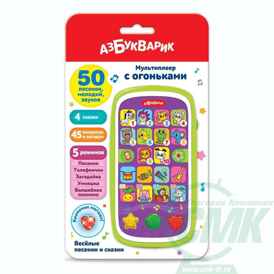 Ваш малыш любит песенки, сказки и веселые игры? Тогда этот мультиплеер – для него. В нем собрано 4 сказки («Репка», «Три поросёнка», «Курочка Ряба», «Волк и семеро козлят»), 50 песенок, мелодий и звуков («Ждёт лошадка малышей», «Жил да был весёлый ёжик», «Котёнок-веселушка», «Мышка-малышка», «Бурый мишка», «Озорной цыплёнок», «Что на завтрак у лягушки?», «Моет слон живот и уши», «Грозный лев», «Забавный щенок», «Лесная считалочка», «Формы всякие вокруг», «Весёлые противоположности» и др.), 45 вопросов и загадок. Малыш может выбрать один из пяти режимов: «Песенки», «Телефончик», «Загадайка», «Умняшка», «Волшебное пианино». С такой многофункциональной игрушкой ребенок будет занят надолго! А разноцветные огоньки на фигурных кнопочках поднимут настроение!