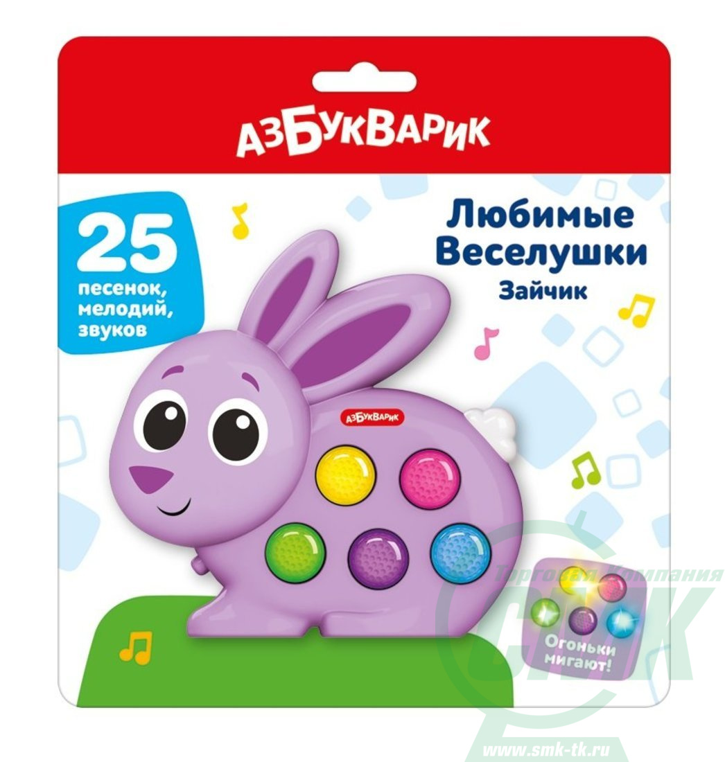 Музыкальный зайчик из серии «Любимые Веселушки» мило улыбается и замечательно поет! Нажимая на разноцветные кнопочки, малыш послушает веселые песенки и мелодии («Зайчик-это я», «Какой чудесный день!», «Добрый жук», «Улыбка», «Яблочко», «Ладушки» и др.), а также множество забавных звуков и голосов зверят. Всего в игрушке 25 песенок, мелодий, звуков. Во время звучания песенок на кнопочках мигают огоньки!