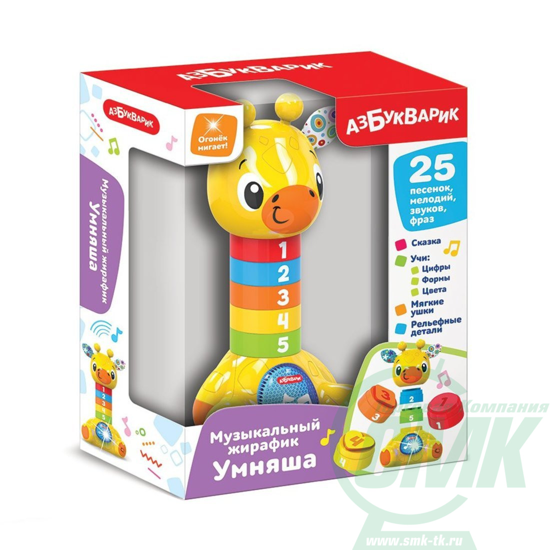 Необычная развивающая игрушка для малышей! Ребенок может сам собрать своего музыкального жирафика. Длинная шея жирафика состоит из рельефных деталей разного цвета и размера. Их можно каждый раз соединять по-разному, при этом изучать цифры, формы и цвета. Нажимая на кнопочку с огоньком, ребенок послушает интересную сказку «Жирафик в цирке», 5 песенок («Как много игрушек на свете!», «Как хорошо уметь считать!», «Цвета радуги», «Чунга-чанга», «Веселые противоположности»), забавные мелодии и звуки. Огоньки на кнопочках мигают под музыку и дарят отличное настроение. А еще у жирафика есть мягкие ушки, которые шуршат.