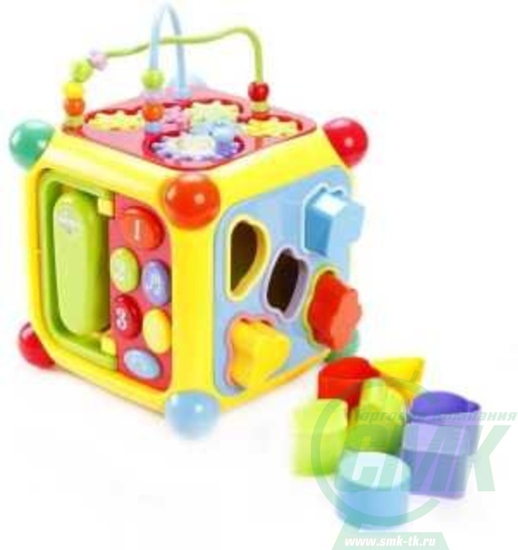 Это настоящий многофункциональный игровой центр! На каждой стороне куба - разные развивающие игры. На двух сторонах расположены сортеры - фигурные отверстия, через которые малыш должен протолкнуть внутрь куба фигурные элементы. На третьей стороне - игрушка-лабиринт с разноцветными колечками и шестеренки, которые можно вращать. Четвертая сторона - это телефон для малышей с большими кнопками. Игра с телефоном сопровождается различными звуками и мелодиями, звук включается с помощью кнопки on/off, расположенной на этой же стороне. Здесь же есть складная ручка для переноски куба. Пятая сторона - музыкальное пианино со своим отдельным переключателем питания on/off. У пианино - пять клавиш разного цвета и четыре функциональных кнопки с изображением музыкальных инструментов. При нажатии на функциональные кнопки звучание пианино становится похожим на звучание соответствующего музыкального инструмента. Еще одна кнопка в виде ноток, расположенная здесь же, включает режим проигрывания мелодий. Шестая сторона - это дверца, с помощью которой куб можно открывать. Дверца открывается ключиком, присоединенным к этой же стороне с помощью веревочки. Игрушка работает от 4 батареек ААА. Размер: 19х19х28 см. Рекомендованный возраст: 1 год +