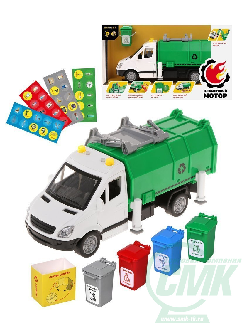 ДЕФЕКТ УПАКОВКИ Машина Городские спасатели ин. Мусоровоз, откр.двери, загрузка и выгрузка бака из контейнера, карточки для сортировки мусора, свет, звук, в комплекте тестовые элементы питания AG13/LR44*3шт. код 870934 арт.870887
