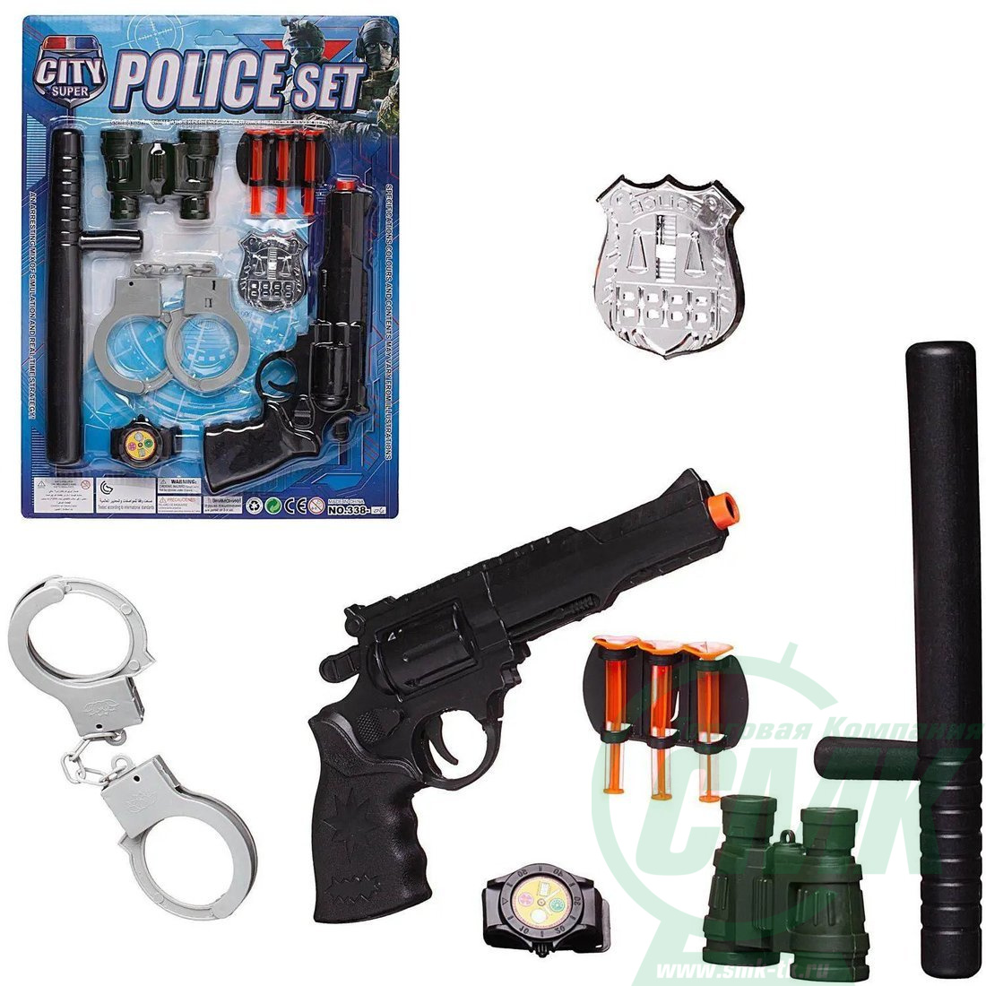 Комплектность: пистолет – 1 шт., часы (муляж) – 1 шт., наручники – 1 шт., бинокль (муляж) – 1 шт., жетон полицейского – 1 шт., дубинка – 1 шт., пуля – 3 шт., держатель для пуль – 1 шт.