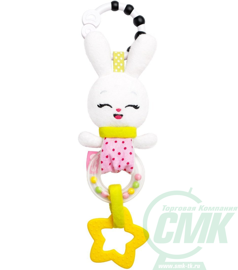Игрушка-подвеска «Зайка Банни» с погремушкой. Теперь с любимым зайкой можно не расставаться и на прогулке. Развивающая подвеска-погремушка настоящий помощник для родителей и идеальный вариант первой развивающей игрушки для малыша первого года жизни. Почему стоит выбрать именно эту игрушку-подвеску? 1. Удобство в использовании. Игрушку можно прикрепить на кроватку, коляску или автокресло, чтобы малышу не пришлось расставаться с любимой игрушкой. 2. Игрушка-подвеска универсальна в использовании : — игры с ребенком — развитие ребенка: две погремушки помогают в развитии внимания, мелкой моторики, слухового восприятия и тактильных ощущений. — помощь в прорезывании зубок: грызунок-прорезыватель отлично справится с этой задачей 3. Игрушка выполнена в приятных цветах, она замечательно подойдет для девочек.