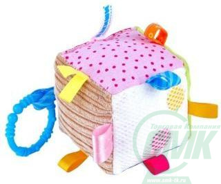 Развивающий кубик с петельками можно подвесить к коляске, кроватке и даже автокреслу за специальное колечко. Игрушка сшита из тканей различной фактуры (трикотаж, вельвет), декорирована пуговками и ленточками. Внутри игрушки спрятана погремушка.