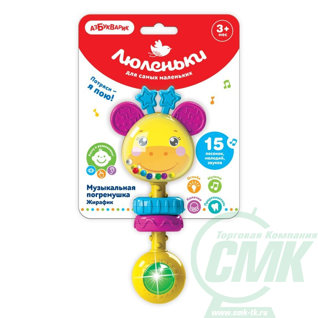 Музыкальная погремушка для малыша в виде симпатичного жирафика с мягкими ушками и рожками! Ребенку нужно просто потрясти погремушку – и жирафик споет песенку. Всего в игрушке 15 песенок, мелодий и звуков («Это кто у нас маленький такой?», «Как хорошо нам с мамочкой», «Чижик-пыжик», «Танец зверят» и др.), а также множество активных элементов. Яркий огонек привлекает внимание, цветные шарики весело звенят! А рельефные силиконовые ушки и пластмассовые колечки развивают тактильные ощущения – ребенку будет приятно потрогать их пальчиками.