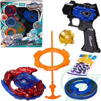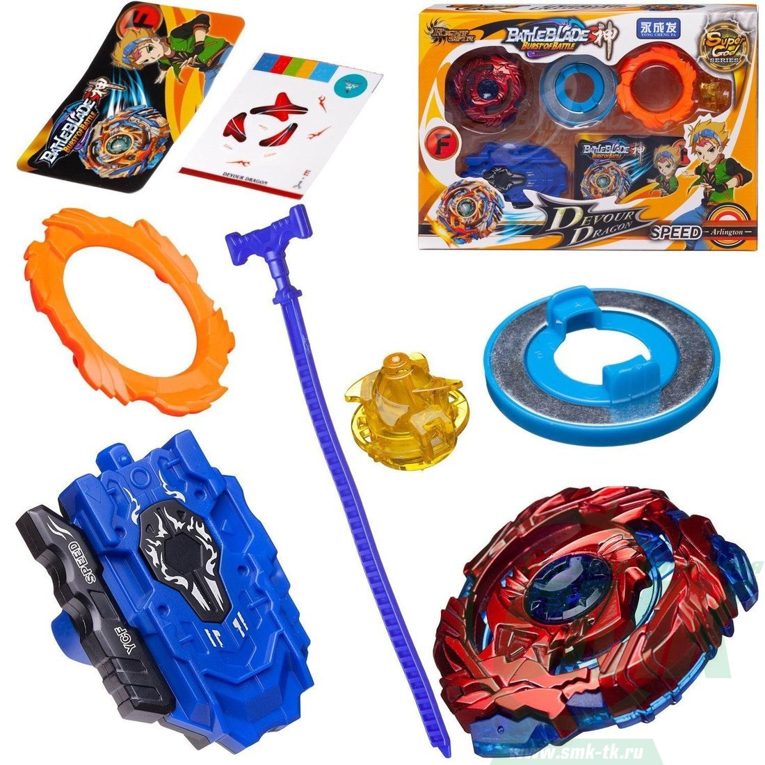 Комплектность: волчок (4 детали), пусковое устройство, пусковая лента, комплект наклеек, карточка.