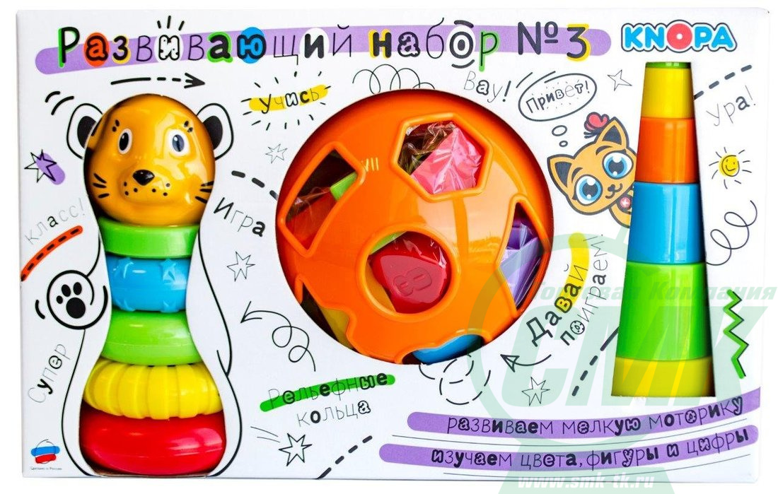 Развивающие наборы от КНОПЫ – фавориты полезных занятий с малышами. Пирамидка с рельефными кольцами, полусфера–сортер и прирамидка со стаканчиками-вкладышами откроют малышу не только новые тактильные ощущения, но и познакомят с понятиями: больше-меньше, выше-ниже, шире - уже и палитрой основных цветов. Все игрушки набора развивают логику, а сортер знакомит с цифрами от 1 до 12.