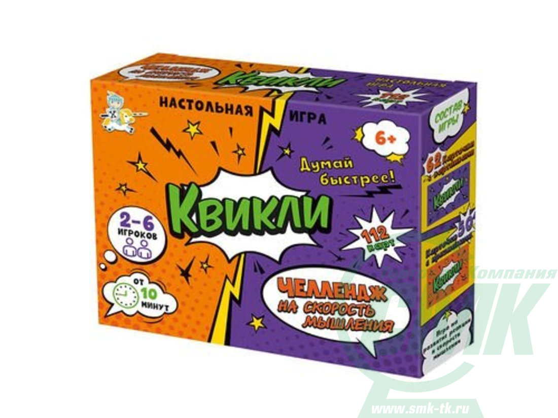 Игра настольная "Квикли" Челлендж на скорость мышления. Состав игры: карточки с заданиями 84*55мм - 112шт, Инструкция на задней стороне упаковки. Материалы - картон. Для детей старше 6 лет