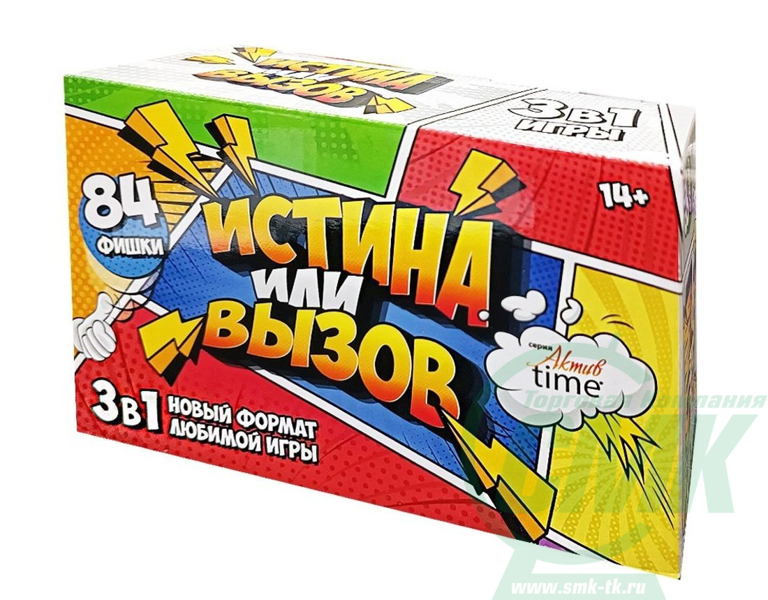 Игра настольная "Истина или Вызов" 3 в 1 серии "Актив time" Состав игры: игровые фишки из плотного картона - 84 шт. (диаметр 5,5 см, толщина 1,5 мм), мешочек для фишек, правила игры. Игра рекомендуется для подростков старше 14 лет.