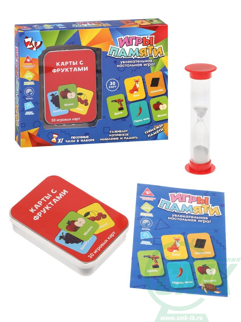 Набор включает в себя 30 карт с изображениями фруктов, песочные