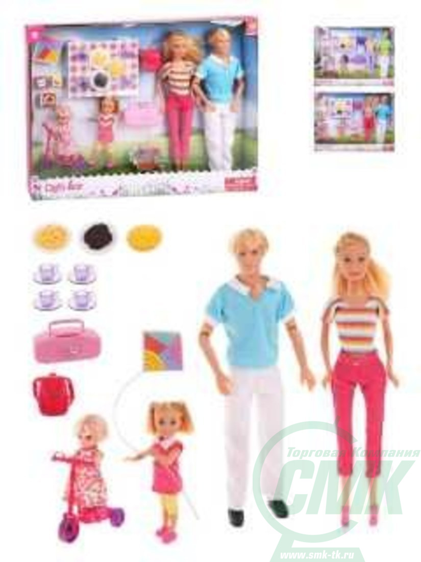 девочки. В комплекте прилагаются следующие игрушечные предметы: 4 куклы (папа, мама, 2 дочки), рюкзак, магнитофон, 3 тарелки с угощениями