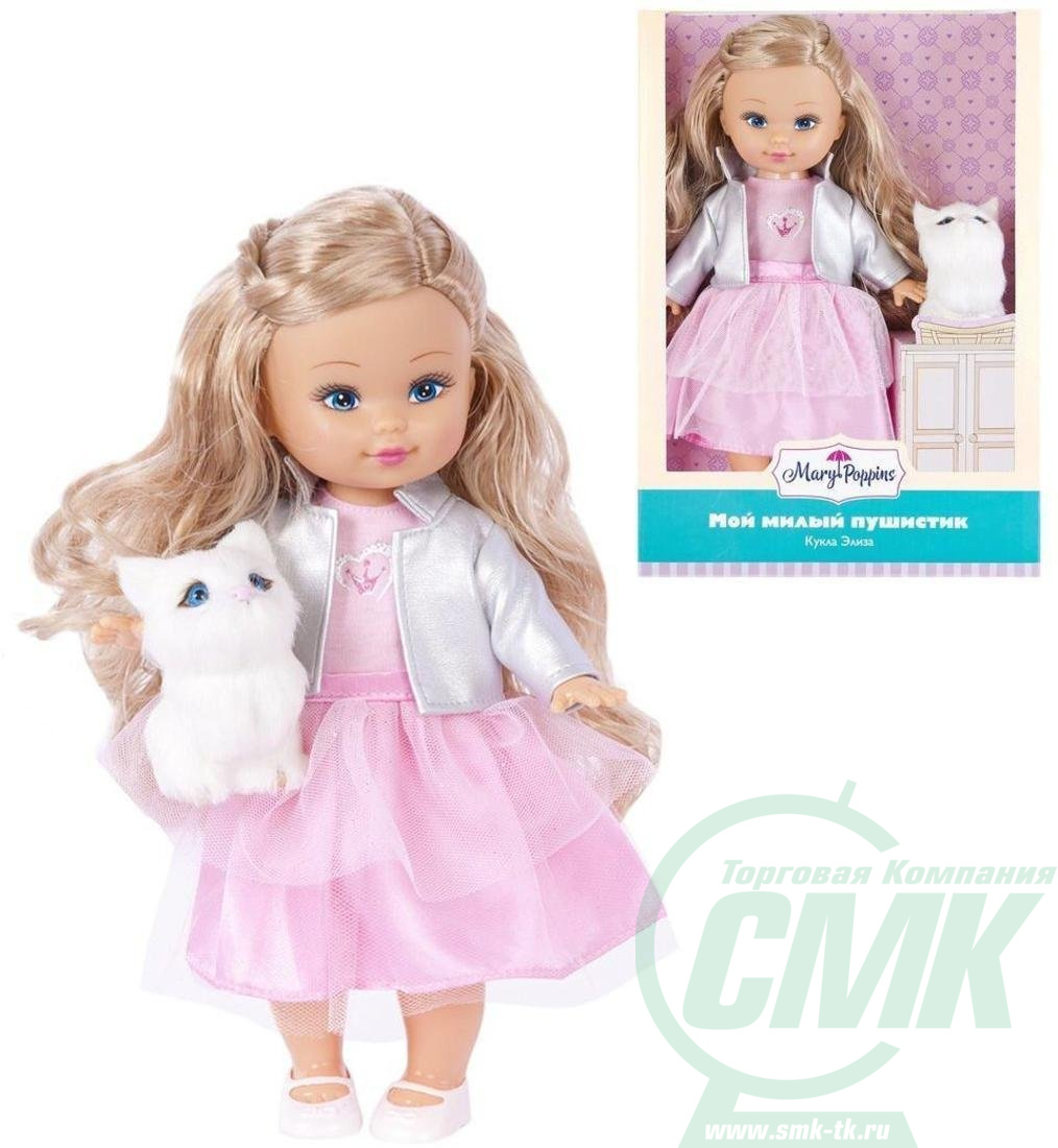 ДЕФЕКТ УПАКОВКИИгра в куклы – важная и неотъемлемая часть детства любой девочки, благодаря которой юные принцессы развивают речь, воображение, творческое начало и навыки заботы о других. Очаровательная кукла Элиза в комплекте с пушистым, меховым питомцем - котёнком. Высота куклы составляет 26 см. Игрушка изготовлена из ПВХ, пластмассы и текстильных материалов. Рекомендованный возраст: 3 года +