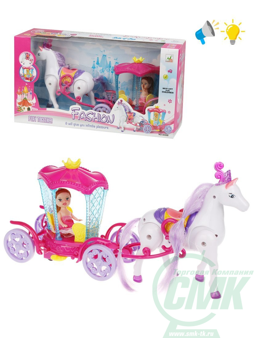 роскошная карета и 1 чудесная лошадка. Колёсики кукольного транспорта крутятся,