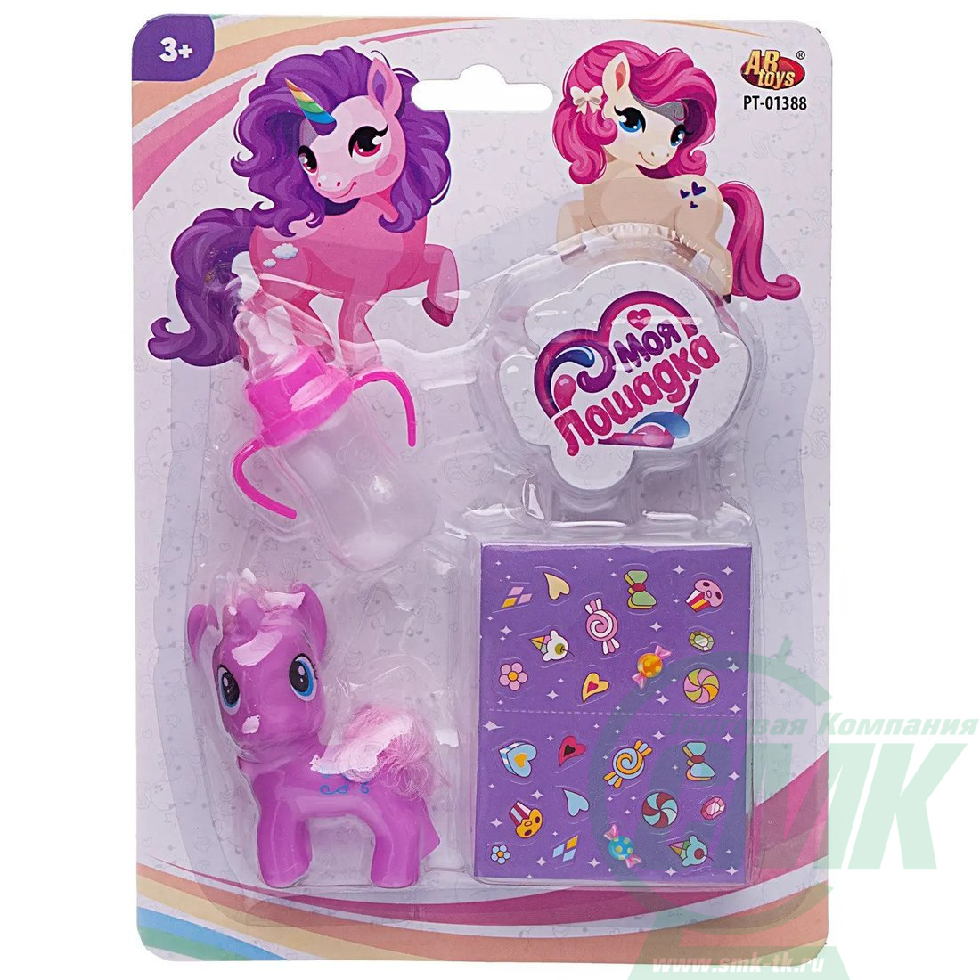 Игровой набор Пони-единорог фиолетовая с бутылочкой-поильником и наклейкам код 601376 арт. PT-01388/фиолетовая