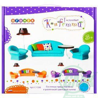Гостиная «Конфетти» - это игровой набор, состоящий из дивана, двух кресел, столика и торшера. Текстиль в набор не входит.Игрушка изготовлена на московском заводе игрушек «Огонек».