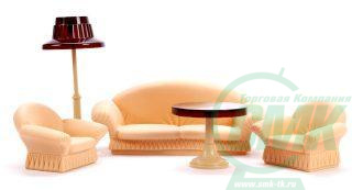 Набор мягкой мебели для гостиной "Коллекция" станет украшением любой кукольной комнатки. Кресла и диван выглядят как красивая мягкая мебель. Торшер и столик добавят уюта гостиной.Набор мебели для кукольной комнаты подойдет для кукол размером около 20 см.