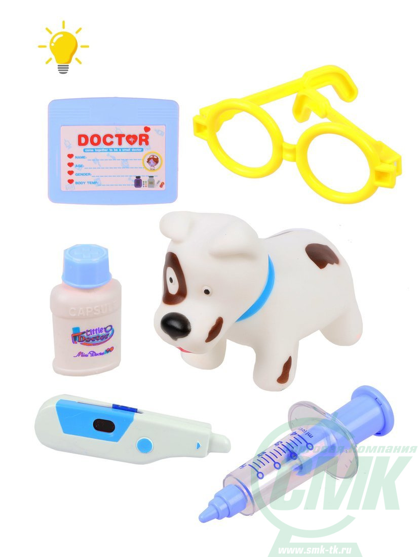 очки, баночка, фигурка щенка, шприц, термометр с подсветкой и бейджик.Размеры