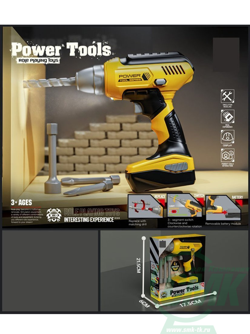 ДЕФЕКТ УПАКОВКИ Игрушка Дрель-шуруповерт, свет, в комплекте 4 сверла, элементы питания ААА*3шт. не входят в комплект, коробка код 615103 арт.T002