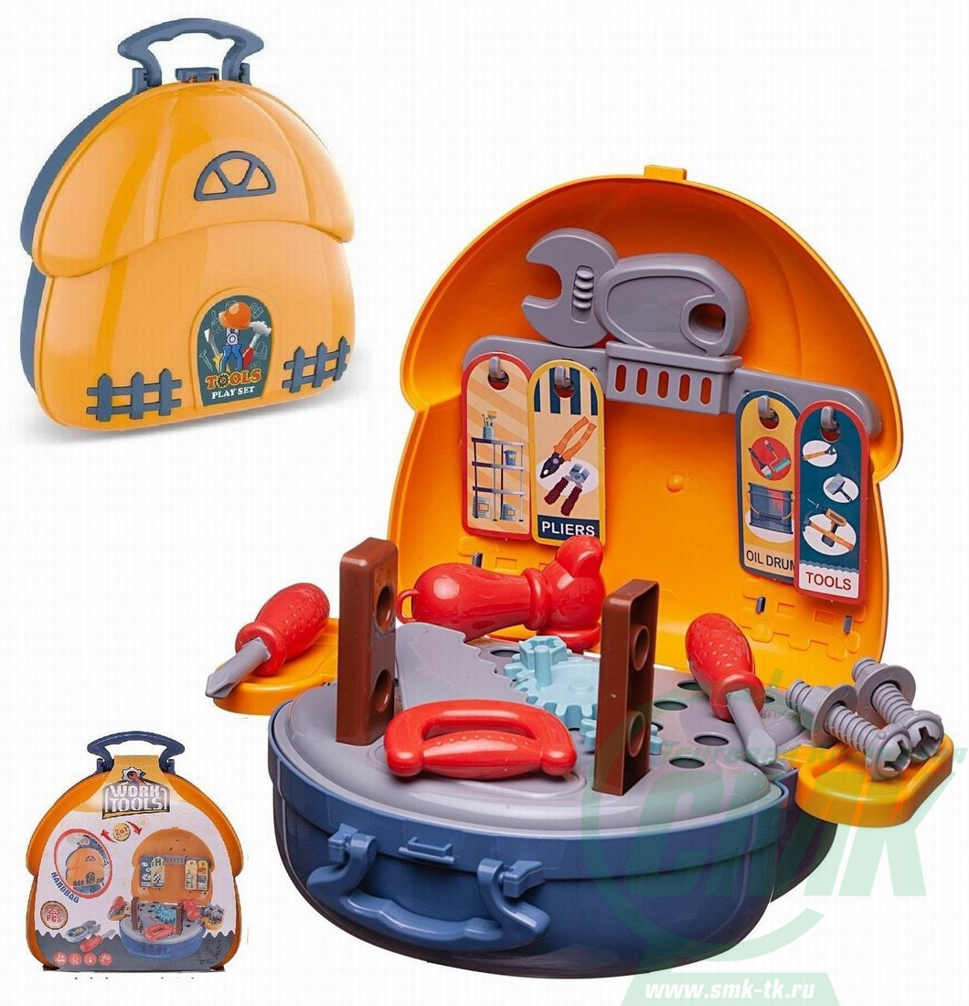 Комплектность: чемоданчик – 1 шт. (2 детали), основание чемоданчика – 1 шт., боковые полочки – 2 шт., навесная планка – 1 шт., шестеренки – 3 шт. (2 вида), пила – 1 шт., отвертка – 2 шт. (2 вида), молоток – 1 шт., газовый ключ – 1 шт., шуруп – 2 шт., гайка – 2 шт., планка с отверстиями – 2шт., таблички тематические – 4 шт., наклейки.