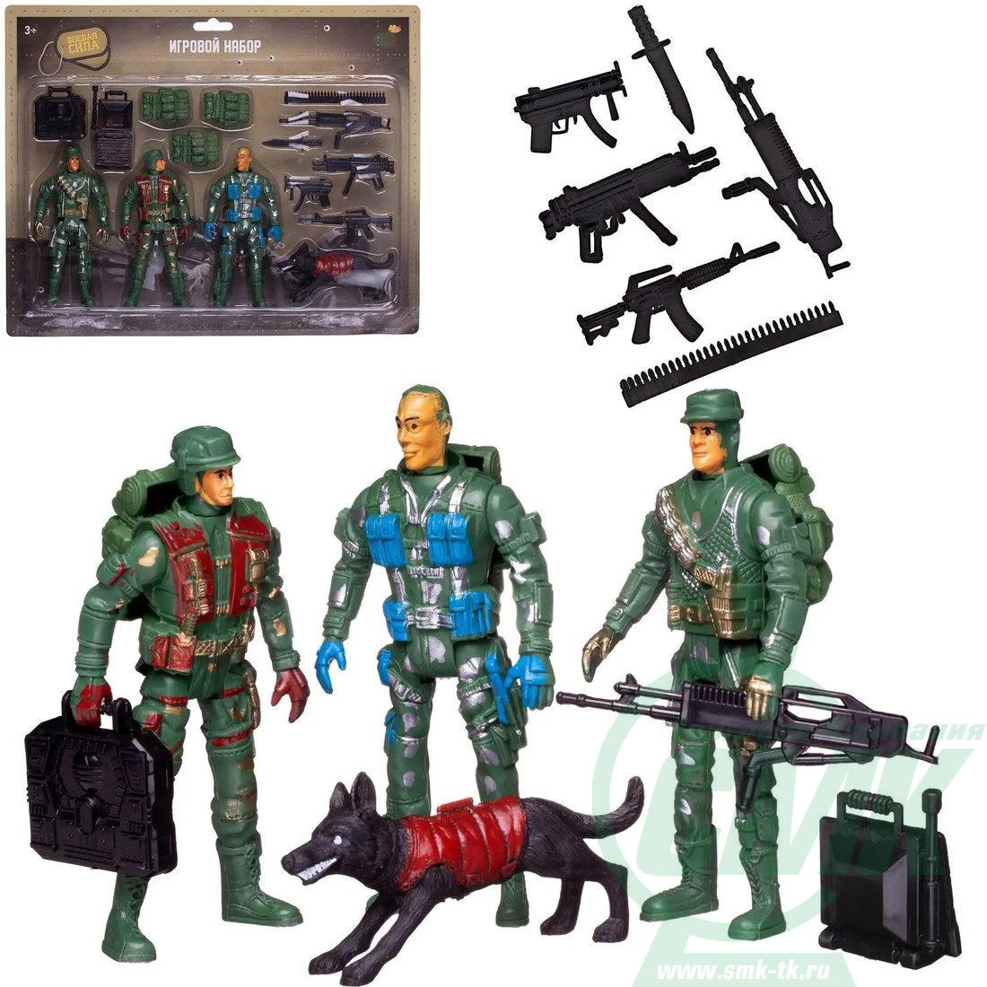 Игровой набор Три солдата с собакой, экипировкой и оружием код 601323 арт.PT-01794