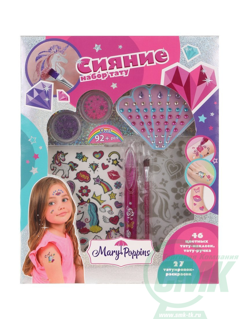 Набор тату "Сияние": 1 гелевая ручка для тату, 2 листа переводных наклеек, 1 лист со стразами, 2 баноски с блестками, 1 кисточка код 456025 арт. 456025
