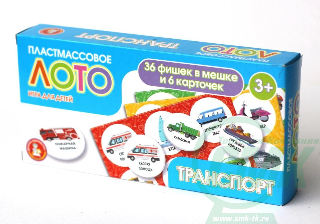 Лото пластиковое «Транспорт». Состав: картонные карточки – 6 шт. (14,5 х 9 см), фишки пластмассовые – 36 шт. (диаметр – 4 см, толщина – 0,3 см), мешочек из ткани для фишек – 1 шт. (30 х 18 см). Материал: картон, пластик, ткань. Для детей от 3 лет, для 1–6 игроков. Лото знакомит с основными видами транспорта, а также развивает память, внимательность и навыки обобщения.