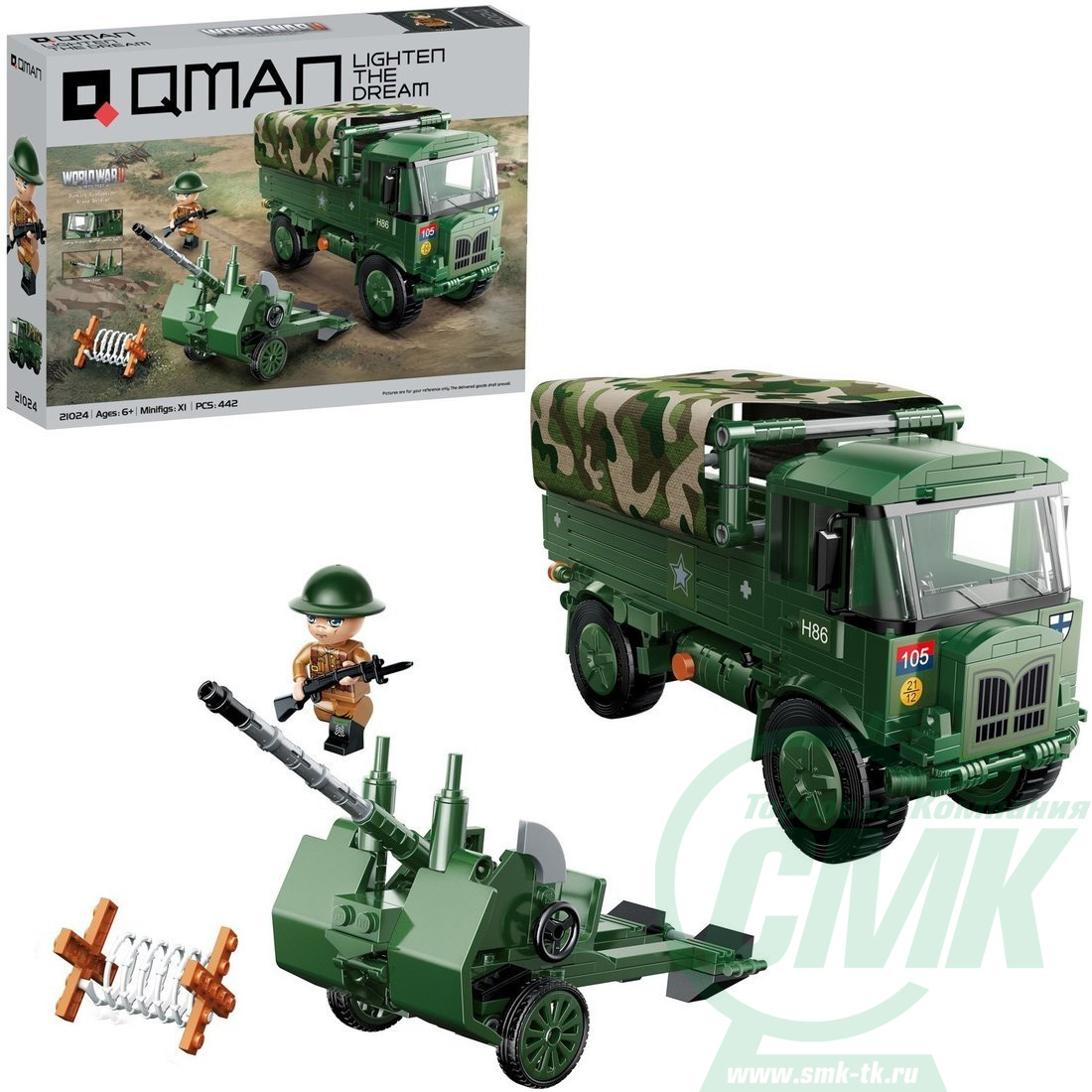 Из конструктора от бренда QMAN из серии «Вторая Мировая Война (WWII)» ребенок может собрать военный грузовик, который перевозит на позицию артиллерийскую пушку. Простое и надежное соединение деталей разных размеров и форм между собой обеспечат специальные крепления. Во время игры ребенок сможет задействовать свою фантазию и придумать интересные сценарии. В процессе сборки и игры с готовой моделью юный конструктор будет развивать мелкую моторику рук, пространственное мышление, внимательность и усидчивость.