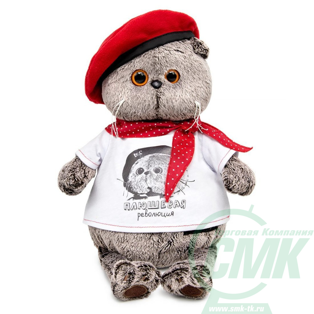 Кот Басик в необычном, революционном комплекте. На Басике белоснежная футболка с оригинальным принтом и красной отстрочкой. Также в комплекте - алый флисовый берет на чёрном ободке.